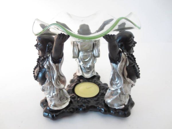 Een Happy Boeddha oliebrander met 3 happy Boeddha`s in het zwart/ zilver. Het is een klassieke diffuser die zijn werkt doet middels een waxinelichtje. Ze is gemakkelijk schoon te maken en vervult de rol van sfeermaker. Deze aromabrander heeft drie dragers onder- en een glazen schaal boven.